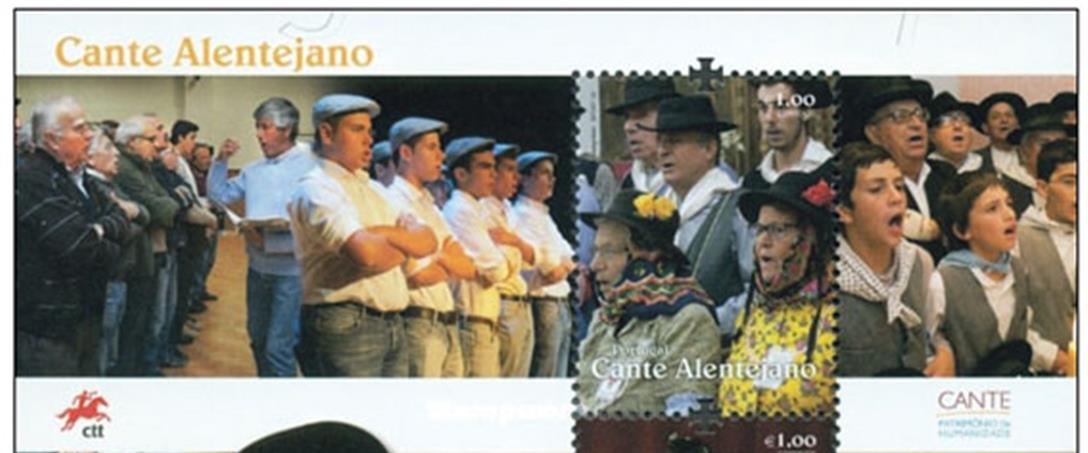 Ilustração: Bloco da emissão cante alentejano. Nele são visíveis os grupos corais Alma Alentejana de Peroguarda e Sindicato dos Mineiros de Aljustrel.