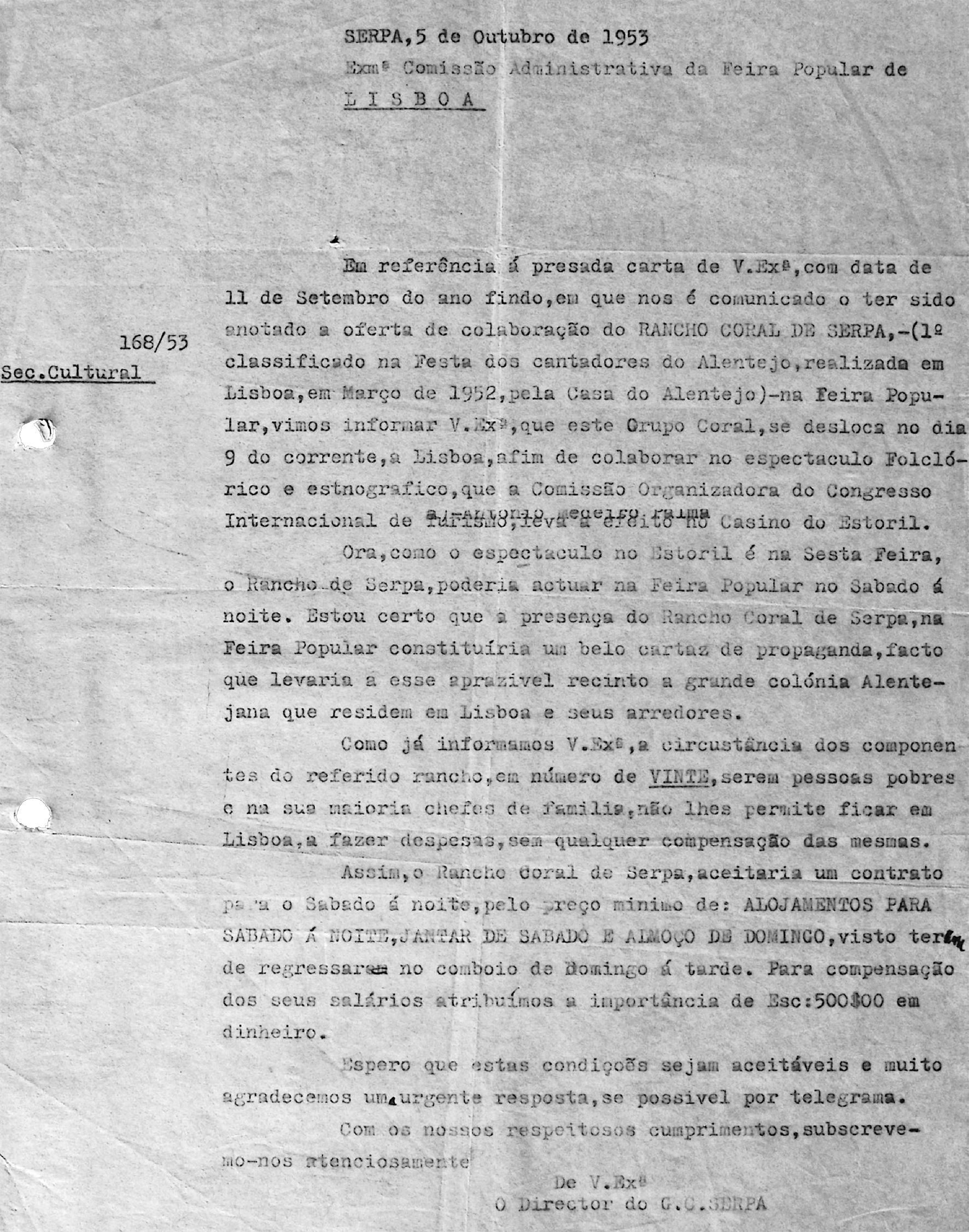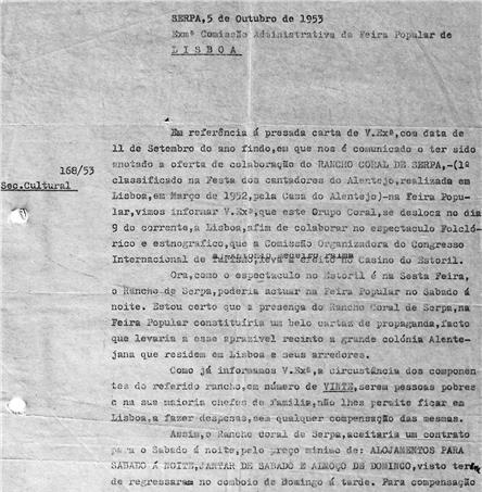 A Entidade Regional de Turismo do Alentejo lançou, recentemente, um novo produto promocional que convida à descoberta da região através de cinco itinerários inspirados no cante. Da brochura publicada ressaltam percursos que “cruzam paisagem, património, tradição e a identidade única do cante alentejano, constituindo um verdadeiro convite a explorar o destino “ao ritmo da sua cultura”, tendo o cante alentejano como fio condutor. Na apresentação da iniciativa participou o Grupo Coral e Etnográfico da Casa do Povo de Serpa, sublinhando, assim, a forte, e estratégica, ligação existente entre o turismo e o cante alentejano. Relação esta que não é nova e muito menos estranha para o Grupo Coral de Serpa, já referenciado, e cujos arquivos, em tratamento pelo Arquivo Digital do Cante, documentam a participação deste grupo coral no VIII Congresso Internacional de Turismo de 1953, que decorreu em Lisboa, na segunda semana de outubro. Desta participação no VIII Congresso e Assembleia Geral da União Internacional de Organismos Oficiais de Turismo (Uioot), precursor da atual Organização Mundial do Turismo (ONU Turismo), encontramos nos arquivos do Grupo Coral e Etnográfico da Casa do Povo de Serpa referências em alguns documentos preparativos da deslocação. Uma primeira menção à participação no evento surge em 4 de outubro de 1953, num ofício dirigido ao senhor Nunes, dando conta da deslocação do grupo a Lisboa, a fim de colaborar no espetáculo folclórico e etnográfico que se iria realizar no Casino do Estoril, estando prevista a chegada a Lisboa, no dia 9, pelas 13:00 horas. Pelo que, em caminho para a Fundação Nacional para a Alegria no Trabalho (FNAT) se previa uma apresentação de cumprimentos na Casa do Alentejo.Na perspetiva de tirar maior proveito da ida a Lisboa, a uma sexta-feira, o grupo coral tenta elaborar um programa cultural para os seus próprios elementos. Pelo que escreve à administração da Feira Popular de Lisboa, disponibilizando-se para ali atuar no sábado à noite, dia 10 de outubro, mediante algumas condições. Nomeadamente, a garantia de dormida, refeições e 500$00 para compensação de salários dos componentes do referido rancho, “em número de vinte, serem pessoas pobres e na sua maioria chefes de família, não lhes permite ficar em Lisboa, a fazer despesas, sem qualquer compensação das mesmas”. Condições com as quais a feira popular concordou, conforme informado em telegrama datado de dia 7 de outubro. Paralelamente, no dia 5 de outubro, o grupo coral envia uma outra carta a Azinhal Abelho, de quem se falou na última crónica, dando igualmente conta da deslocação a Lisboa e dos trajos que iriam apresentar, ganhões, almocreves, pastores, porqueiros, boieiros, entre outros. Nesta carta solicita-se a intervenção do destinatário junto da administração da Feira Popular de Lisboa, de forma a que fosse aceite a proposta apresentada pelo grupo coral. Visto que, só assim, seria possível satisfazer o desejo dos “rapazes” ficarem em Lisboa, no domingo, para “assistirem a um jogo de futebol”. O grupo terá regressado a Serpa, de comboio, no domingo, dia 11, depreendendo pelo teor das missivas. Graças à documentação arquivada, é possível partilhar esta história real da participação do cante num evento de extrema importância para o Turismo. Segundo os arquivos da “RTP”, a representação portuguesa foi liderada por Jorge Felner da Costa e contou com discursos de figuras como José Manuel da Costa, secretário Nacional da Informação (SNI), à qual assistiram delegações de 45 países, neste congresso que tinha como objetivo demonstrar a “tranquilidade” e o potencial turístico do País a uma audiência global, afirmando-se como um marco relevante para a projeção internacional de Portugal no período pós-Segunda Guerra Mundial, consolidando o País como um destino turístico emergente.A julgar por documentação avulsa, ainda não tratada, esta poderá não ter sido a primeira atuação do Grupo Coral e Etnográfico da Casa do Povo de Serpa no Casino do Estoril e até outros grupos terão por lá passado nesta década, mas a história que nos contam os documentos logo nos dirá… Até lá, seguimos a reconstrução deste grande puzzle, com o empenho que temos tido até aqui, de todos os grupos e muitos amigos que nos fazem chegar regularmente novas fontes.