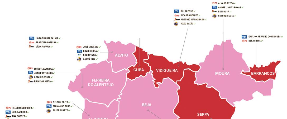 Por fim, em Vidigueira as novidades estão nos nomes da CDU para as freguesias de Pedrógão do Alentejo, com Ester Aires, e Vila de Frades, com Jorge Beiçudo, e na escolha de Luís Caipirra, pela coligação PSD/CDS-PP, para Selmes e Alcaria da Serra.