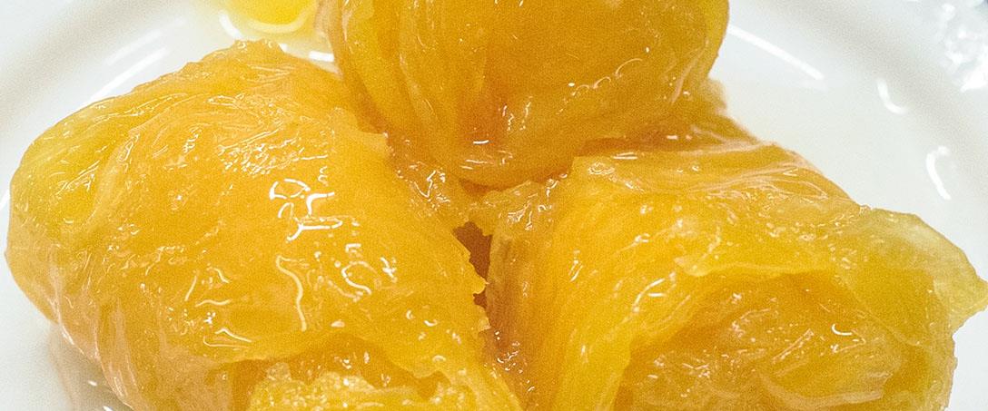 “Estas trouxas-de-ovos distinguem- se de outras, como as das Caldas ou as de Aveiro, sobretudo, porque são cónicas. De resto, fazem-se de modo semelhante. Cozinha-se gemas de ovo em calda de açúcar em forma de placas que são depois recheadas com fios de ovos, enroladas e apertadas numa das pontas para fazer o cone. A calda anterior é vertida, por fim, sobre as trouxas”, sublinha Cristina Castro, autora de A Doçaria Portuguesa – Sul, onde explica a origem de diversos doces típicos do Baixo Alentejo. Entre eles, destacam- -se as túberas (ou “tubaras” se optarmos pelo vocábulo grafado por Castro e Brito), uma massa de amêndoa recheada com ovos- -moles, os queijinhos de hóstia, segundo receita conventual já comum no início do século XVIII, os papos de anjo, colocados dentro de papéis de seda recortados, ou as queijadas das Maltesinhas, pequeno bolo com nozes, mel, chila e fruta cristalizada.